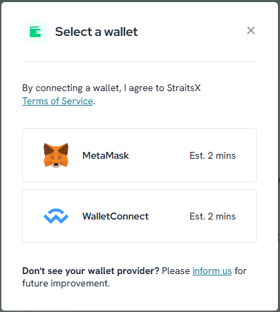 Step 5: Select “MetaMask” or “WalletConnect”, depending on the wallet provider you are using.