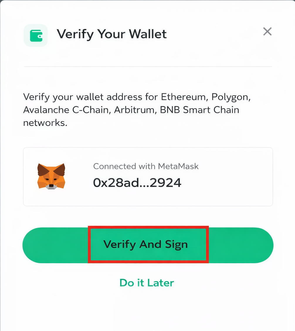 Step 6: Once you have connected your respective wallet, you will be asked to verify and sign to whitelist your blockchain address to your StraitsX account. From here, click on “Verify and Sign”. By doing so, your wallet will be automatically whitelisted for Ethereum, Polygon, Avalanche C-Chain, Arbitrum, and BNB Smart Chain networks simultaneously. You can also select "Do It Later" if you decide to link it later.