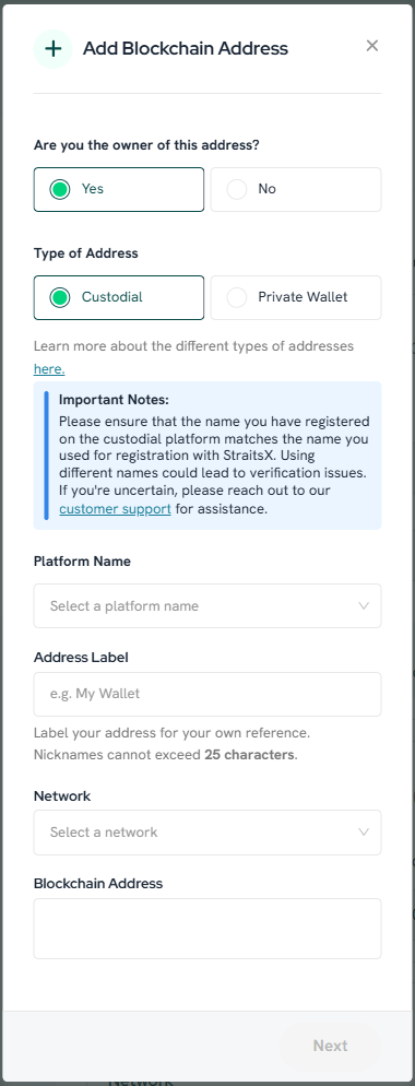 If Custodial, ensure the name registered on the custodial platform matches your StraitsX account name to avoid verification issues.