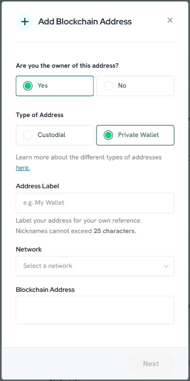 Type of Address: Choose "Custodial" (exchange/wallet platform) or "Private Wallet" (non-custodial).