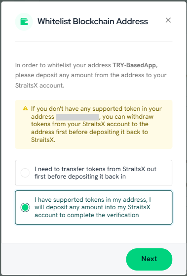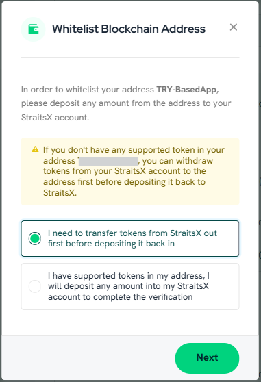 Step 8: Please note that to complete the whitelisting process for a personal address (non-custodial address), you need to verify ownership by making a deposit from that address to your StraitsX account. There are two ways to complete this process: