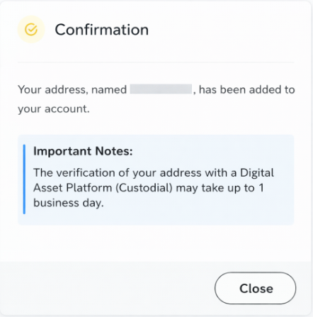 You are required to whitelist the address before initiating any blockchain transfers. To do so, you must submit a whitelisting request, which will be reviewed by our team. During this review, we will verify the details to ensure the address belongs to a supported digital asset platform and meets security requirements. You will receive a confirmation once the review is complete.