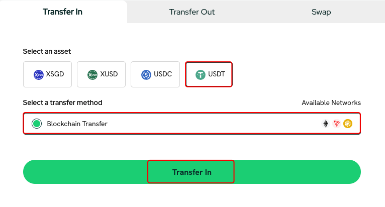 USDT can be transferred to either a personal wallet (non-custodial address) or a supported Singapore-registered digital asset platform (custodial address).
