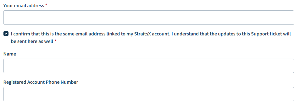 3. Enter your email address and check the box to confirm that it is the same email address linked to your StraitsX account. You will also need to write down your name and the registered account phone number.