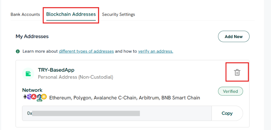 If you no longer need a previously verified blockchain address, you can remove it from your account through the dashboard.
