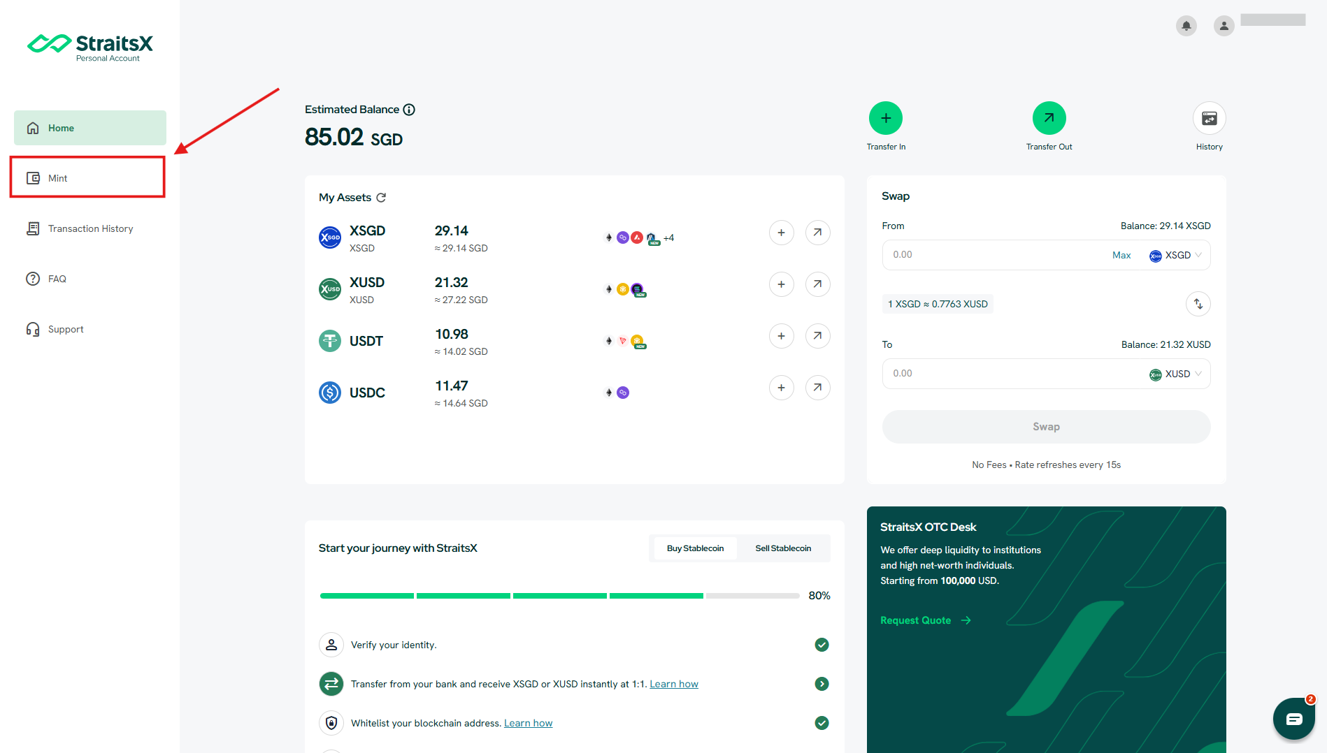 Log in to your StraitsX dashboard and click on the Mint tab in the navigation menu.