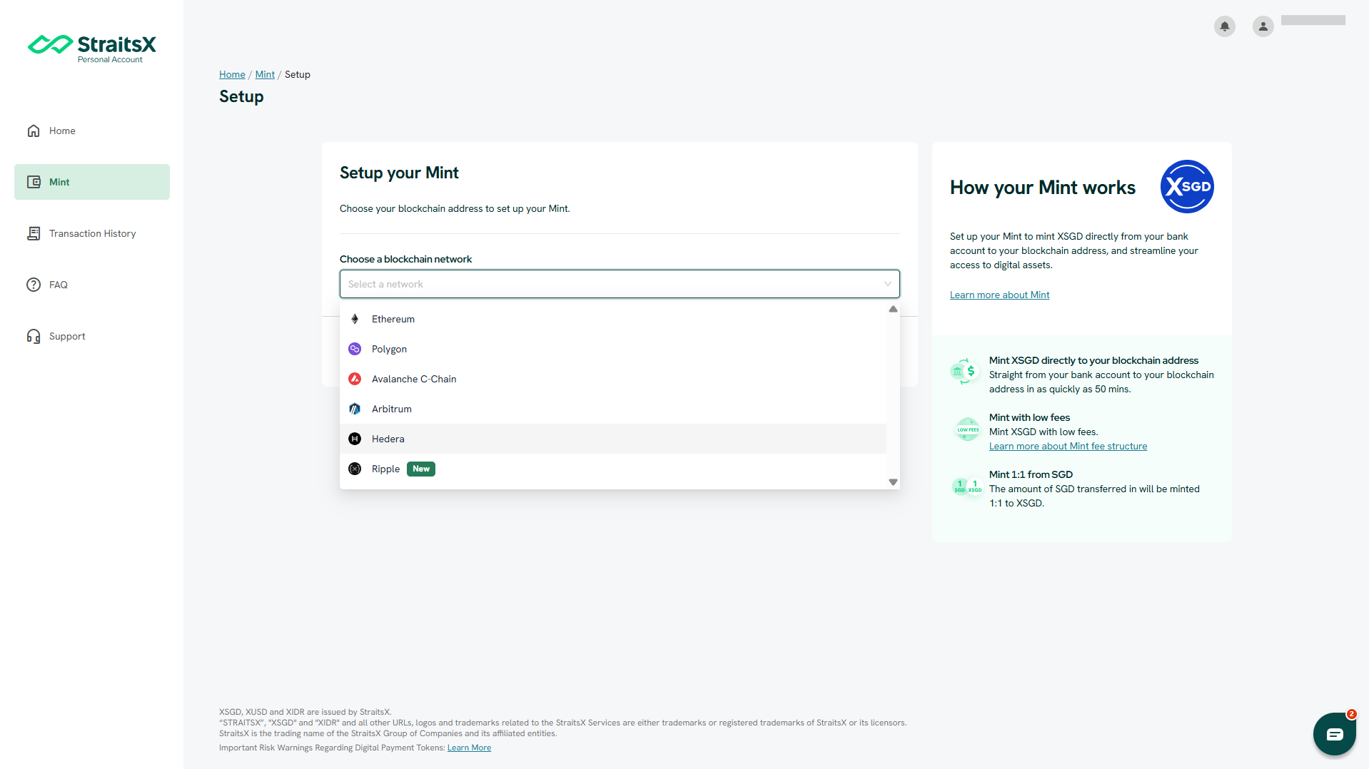 Choose the blockchain network where you would like your XSGD to be issued. Supported networks: Ethereum (ERC-20), Polygon, Avalanche C-Chain (AVAX), Arbitrum, Hedera, Ripple (XRPL), and Solana.