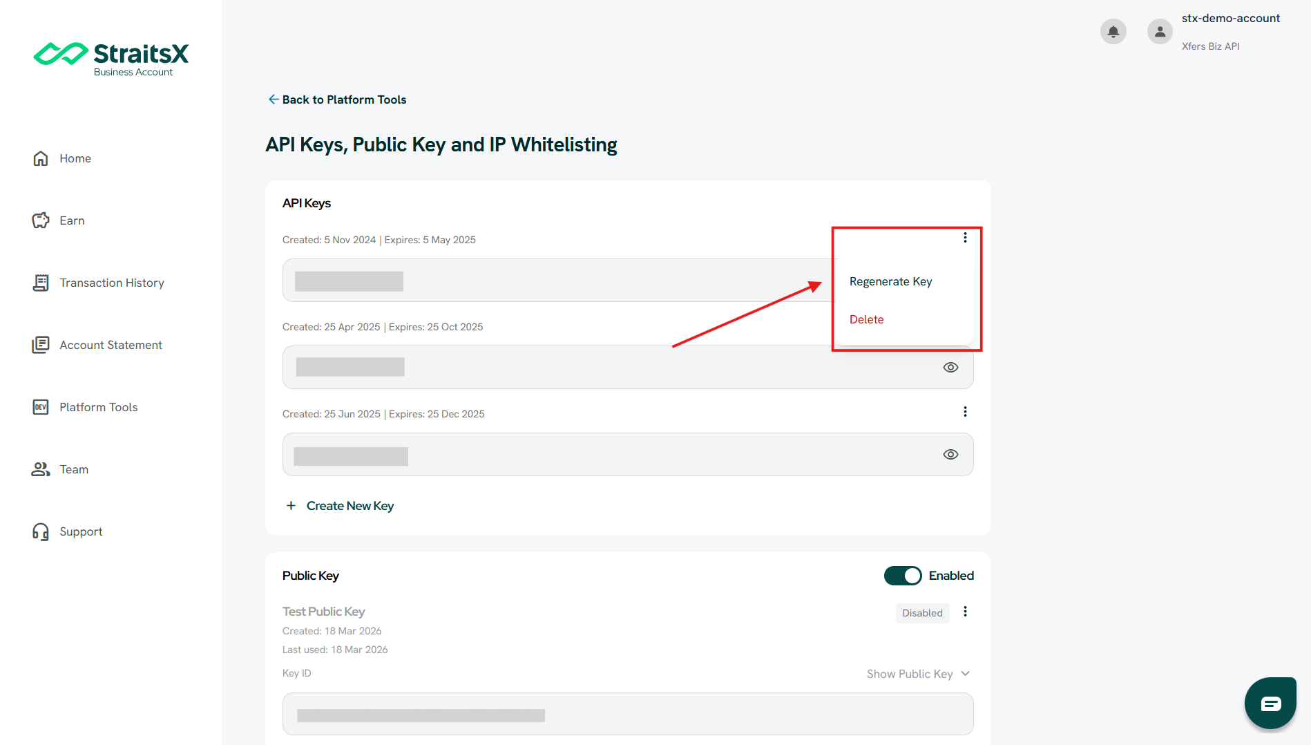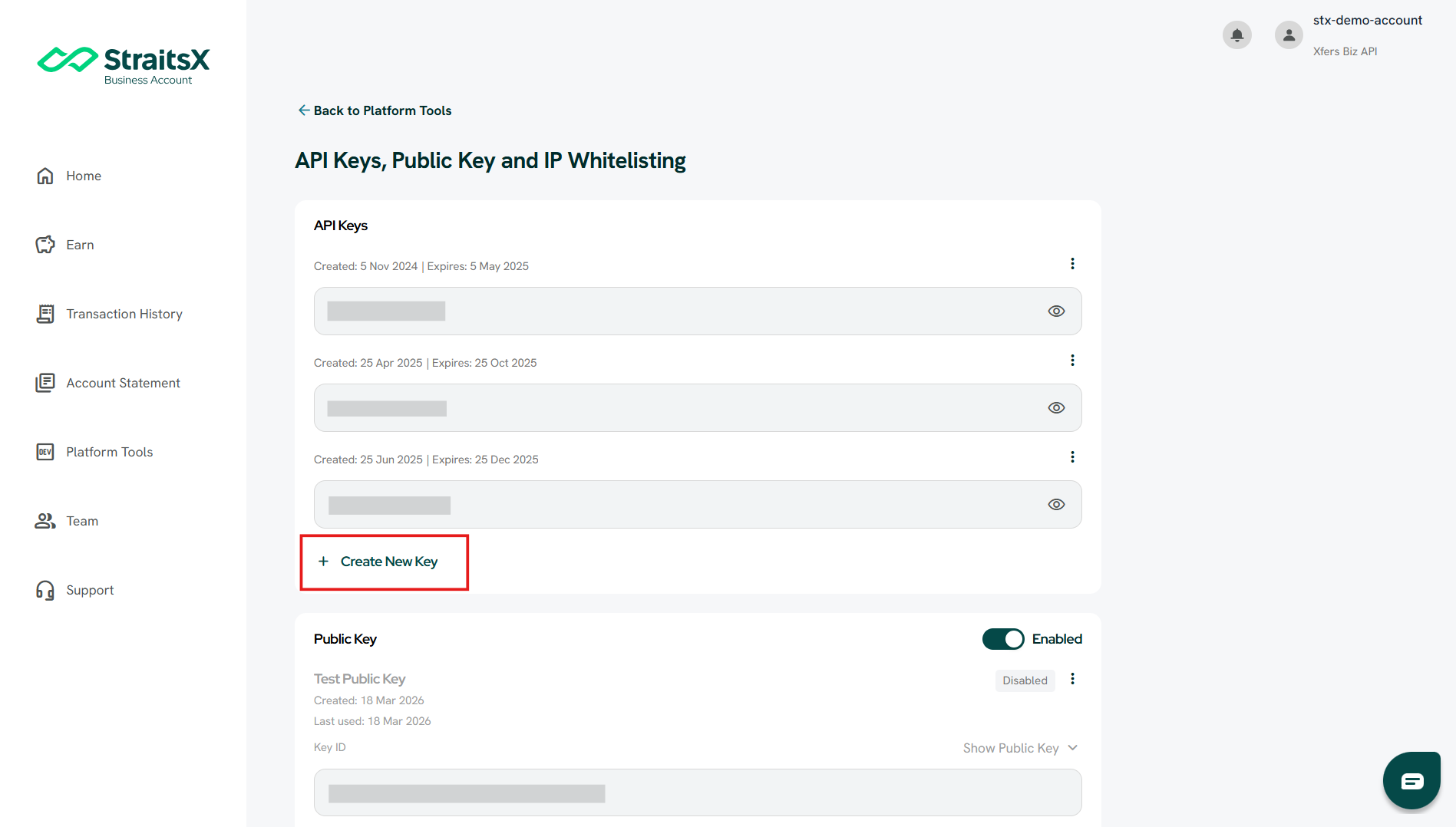 You can create an API key directly from the StraitsX Business Dashboard to enable integration with StraitsX APIs.