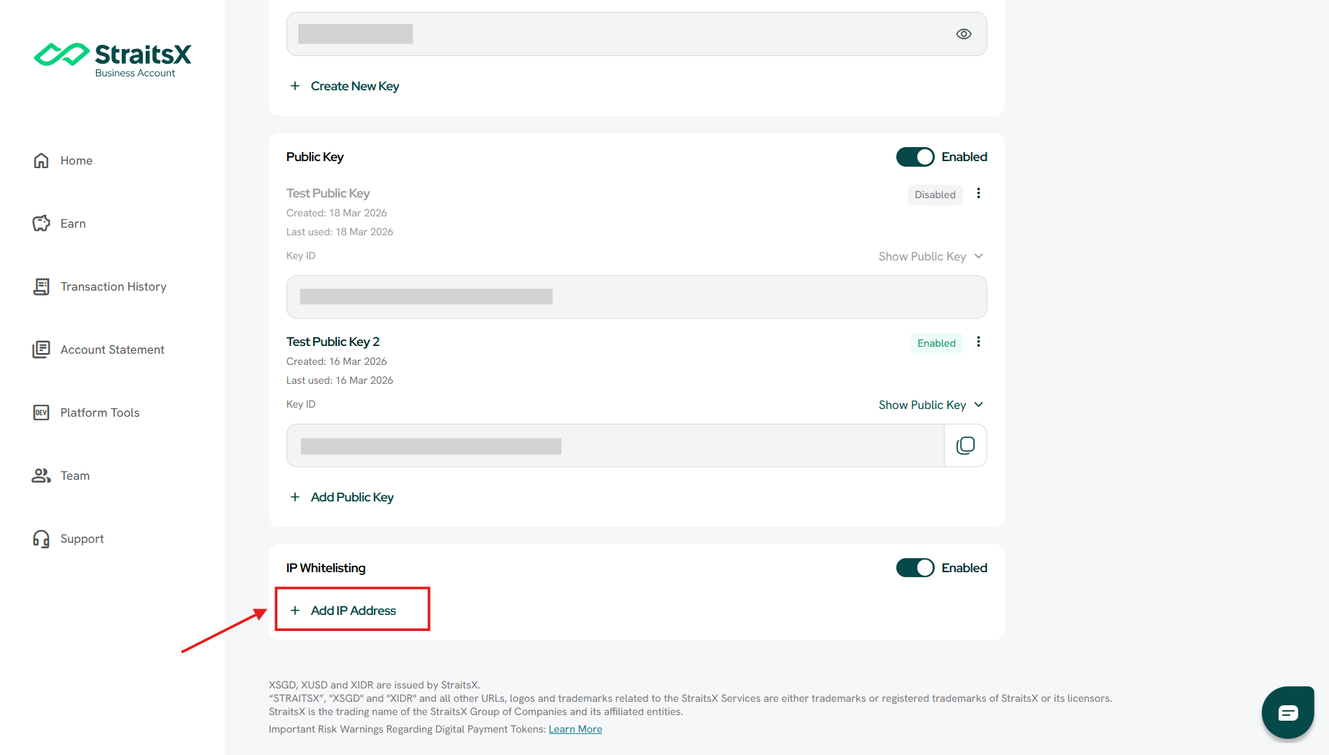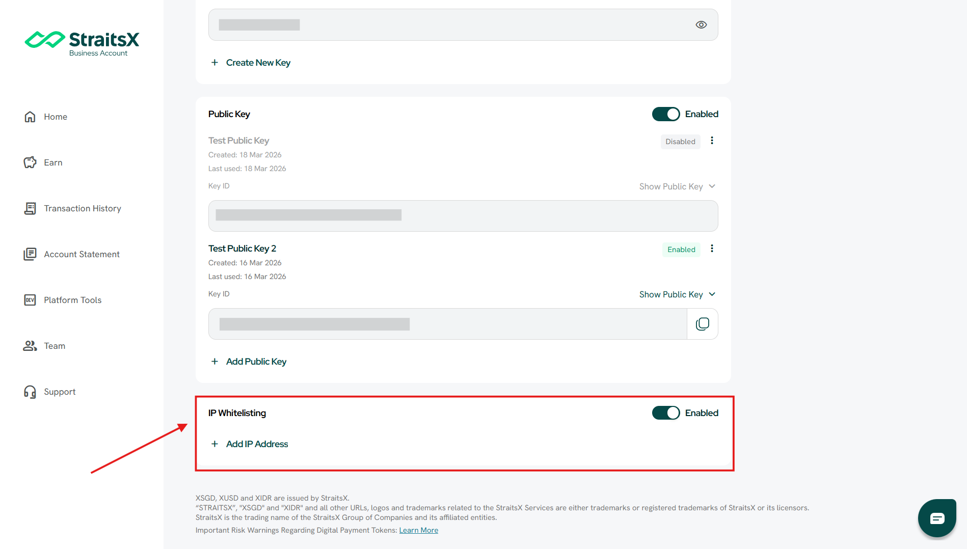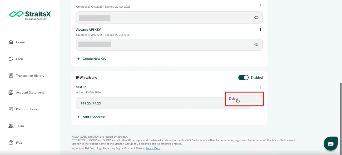 IP whitelisting is a security feature that allows you to control which IP addresses can access the StraitsX API. When enabled, only requests coming from the approved (whitelisted) IP addresses will be accepted. All other requests will be rejected.